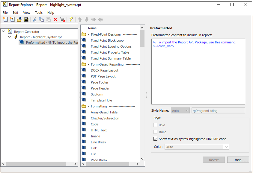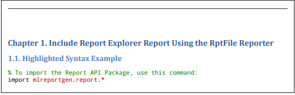 rpt = mlreportgen.report.Report("My Report","pdf"); chap = mlreportgen.report.Chapter... ("Include Report Explorer Report Using the RptFile Reporter"); sect1 = mlreportgen.report.Section... ("Highlighted Syntax Example"); % Evaluate the expression and assign it to the code variable evalin('base','code_var = "import mlreportgen.report.*"'); rptfile = mlreportgen.report.RptFile("highlight_syntax.rpt"); add(sect1,rptfile) add(chap,sect1) add(rpt,chap) close(rpt) rptview(rpt)