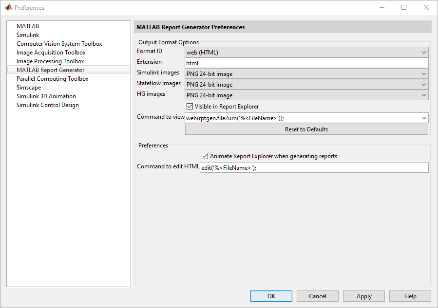 | Команда «Просмотр» | Укажите команду MATLAB, которую необходимо использовать для просмотра отчета. Каждый формат файла имеет соответствующую настройку команды представления по умолчанию. Можно изменить команду вида (например, для поддержки использования обозревателя инженерных систем). |