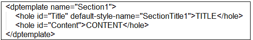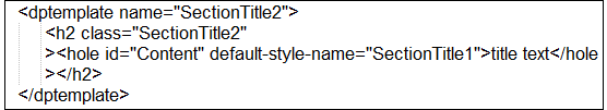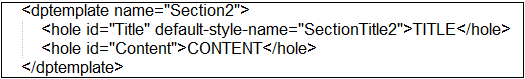 Шаблоны Section2-Section6 определяют формат подразделов, созданных Section репортер. Каждый шаблон содержит элементы отверстий, которые определяют расположение отверстий, заполняемых содержимым репортера секции. Title и Content соответственно. Отверстие заголовка в каждом шаблоне определяет стиль заголовка по умолчанию для уровня подраздела, определенного шаблоном.