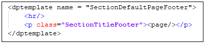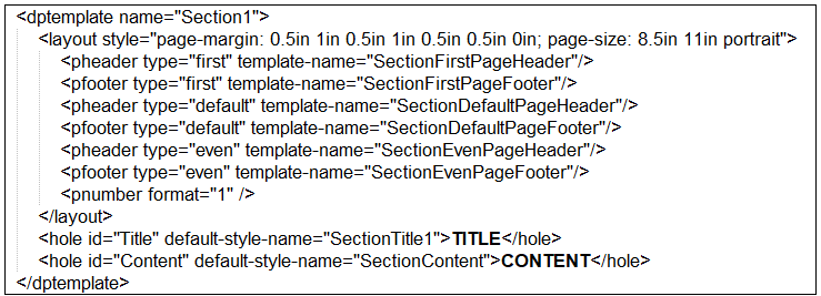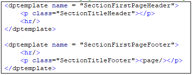 Элементы feader и pfooter в макете Section1 определяют шаблоны, используемые для определения содержимого и макета колонтитулов страниц раздела верхнего уровня. Шаблоны верхнего и нижнего колонтитулов находятся в одном файле библиотеки шаблонов (docpart_templates.html) в качестве самого шаблона Section1. Section reporter использует только шаблоны первой страницы и страницы по умолчанию.