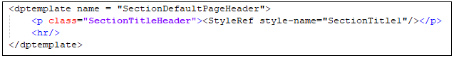 задает абзац, содержащий стилереф, за которым следует горизонтальное правило. Во время создания отчета API Report заменяет элемент styleref содержимым заголовка раздела верхнего уровня, создавая тем самым рабочую головку.