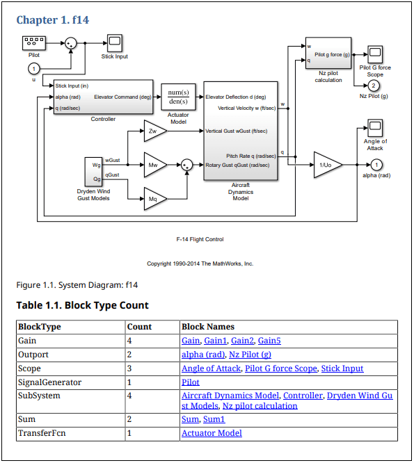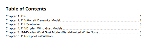 titlepg = TitlePage(); titlepg.Title = "f14 Model Block Types "; titlepg.Author = "MathWorks"; add(rpt,titlepg); toc = TableOfContents; add(rpt,toc);
