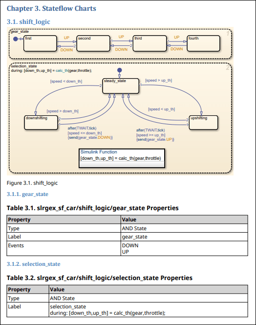 ch = Chapter("Title", "Stateflow Charts"); chdiagFinder = ChartDiagramFinder(model); while hasNext(chdiagFinder) chart = next(chdiagFinder); section = Section("Title",chart.Name); append(section,chart); objFinder = StateflowDiagramElementFinder(chart); sfObjects = find(objFinder); for sfObj = sfObjects title = sfObj.Name; if isempty(title) title = sfObj.Type; end objSection = Section("Title",title); append(objSection,sfObj); append(section,objSection); end append(ch,section); end append(rpt,ch);