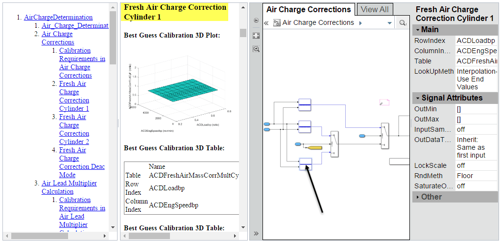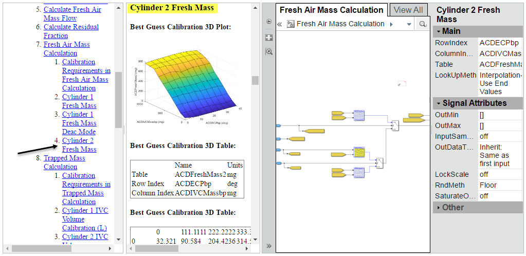 API-интерфейс встроенного веб-представления создает оглавление (оглавление) на основе заголовков разделов отчета. При щелчке по записи заголовка оглавления на панели содержимого отображается соответствующий раздел отчета. Также отображается и мигает соответствующий элемент модели. Связанный блок модели в данном примере руководства по калибровке выделен желтым цветом на панели веб-просмотра.