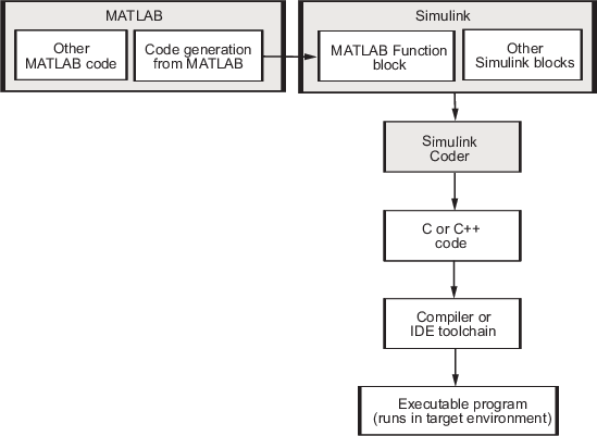 Интегрируя код MATLAB для генерации кода в функциональные блоки MATLAB в модели Simulink, а затем генерируя код C/C + + с помощью продукта Simulink Coder