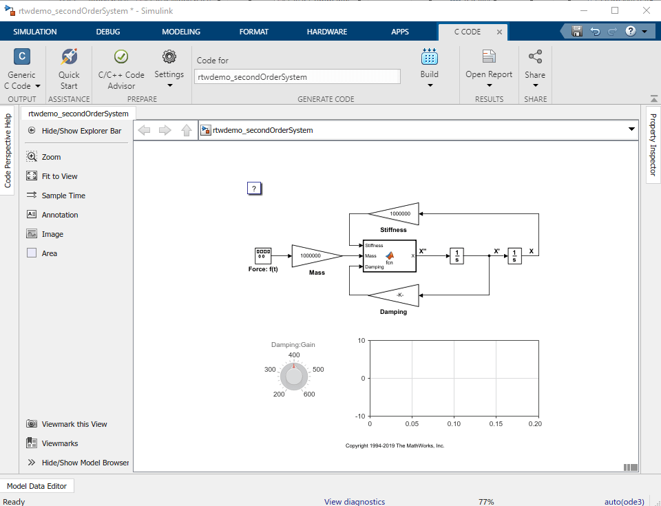 Генератор кода создает папку rtwdemo_secondOrderSystem_ert_rtw в текущей рабочей папке и помещает файлы исходного кода в эту папку. Созданный код находится в двух основных файлах: rtwdemo_secondOrderSystem.c и rtwdemo_secondOrderSystem.h. Файл rtwdemo_secondOrderSystem.c содержит код алгоритма, включая код решателя ODE. Данные модели и функции точек входа доступны вызывающему абоненту путем включения rtwdemo_secondOrderSystem.h. rtwdemo_secondOrderSystem.h файл включает в себя extern объявления для блочных выходов, непрерывных состояний, выходных данных модели, точек входа и данных синхронизации.