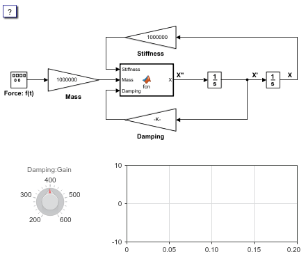 Модель реализует физическую систему второго порядка, называемую идеальной системой масса-пружина-демпфер. Блоки усиления представляют компоненты системного уравнения: Mass, Stiffness, и Damping. Уравнение для системы - mX "+ cX '+ kX = f (t).