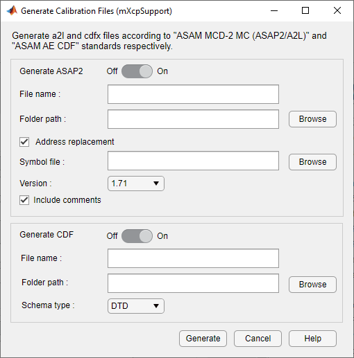 Создайте и настройте файл ASAP2 и файл CDF (формат данных калибровки) для модели с помощью инструмента «Создать файлы калибровки». По умолчанию инструмент создает последнюю поддерживаемую версию файла A2L в соответствии со стандартами ASAM MCD-2 MC, но можно создать другую версию. Можно настроить параметры файлов калибровки, такие как версия файла A2L и тип схемы для файла CDF. Для получения дополнительной информации о стандарте ASAM MCD-2 MC (ASAP2) и стандартах ASAM CDF перейдите на веб-сайт ASAM по адресу www.asam.net.