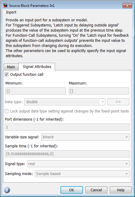 В ссылке модели дважды щелкните входной порт, чтобы открыть диалоговое окно Параметры исходного блока (Source Block Parameters). На закладке Signal Attributes выберите параметр Output function call. Нажмите кнопку ОК.