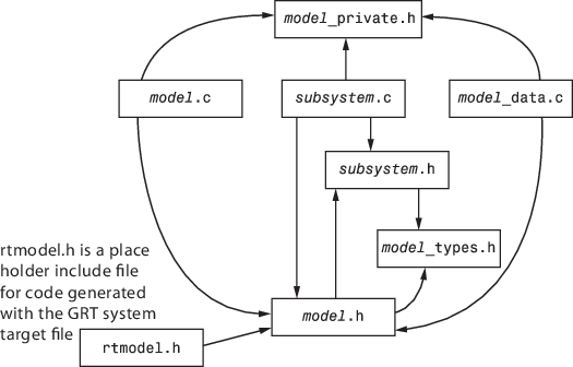 Файлы заголовков родительской системы () включать файлы заголовков дочерних подсистем (model.h). В более многоуровневых моделях подсистемы аналогичным образом включают файлы заголовков своих детей в иерархию моделей. Как следствие, подсистемы способны рекурсивно просматривать свои дочерние подсистемы и просматривать корневую систему, потому что каждая subsystem.h или subsystem.c включает subsystem.cpp и model.h.model_private.h