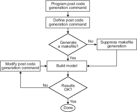 .После программирования команды генерации посткодов сообщите процессу сборки, что команда существует, и добавьте ее к обработке сборки модели. Определите команду с помощью PostCodeGenCommand параметр конфигурации модели. При определении команды создания посткодов процесс сборки оценивает команду после создания и записи сгенерированного кода на диск и перед созданием make-файла.