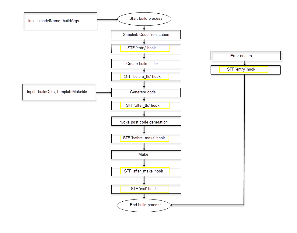 • hookMethod: Символьный вектор, указывающий стадию процесса построения, из которой STF_make_rtw_hook вызывается функция. Следующая блок-схема суммирует процесс построения, выделяя точки захвата. Допустимые значения для hookMethod являются 'entry', 'before_tlc', 'after_tlc', 'before_make', 'after_make', 'exit', и 'error'. STF_make_rtw_hook функция отправляется в соответствующий код с помощью switch заявление.
