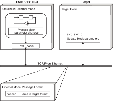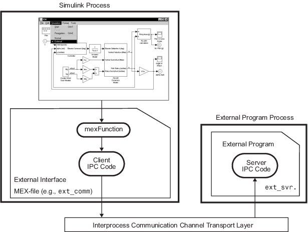 Внешний режим поддерживает связь через TCP/IP, последовательный и пользовательский транспортные протоколы. Имя MEX-файла определяет имя MEX-файла, реализующего связь между хостом и целью. Значение по умолчанию для TCP/IP: ext_comm, MEX-файл, поставляемый с программным обеспечением Simulink Coder. Это значение по умолчанию можно переопределить, указав другие файлы. Если требуется поддержка других транспортных уровней, см. раздел Создание транспортного уровня для связи TCP/IP или последовательного внешнего режима.