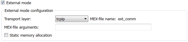 Флажок Статическое выделение памяти управляет распределением памяти для буферов связи внешнего режима в целевом объекте. В этом примере не устанавливайте флажок. Дополнительные сведения см. в разделе Управление выделением памяти для буферов связи в целевом устройстве.