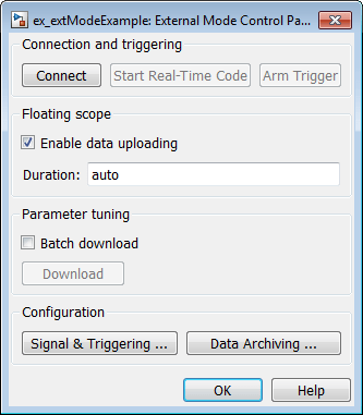 ExtModeEnableFloatingoff, on | Панель управления внешним режимом: флажок «Включить отправку данных» | Включение или отключение подрыва и отмены триггеров при установлении соединения с плавающими областями. |