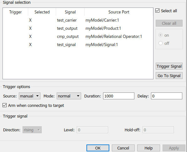 В этом диалоговом окне можно выбрать сигналы для мониторинга и настроить триггер для загрузки данных из целевого приложения. В этом примере используются настройки по умолчанию. Например: