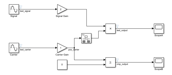 Подключите блок синусоидальной волны к блоку усиления и назовите соединение, например: Test Signal.