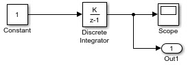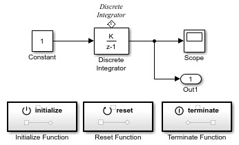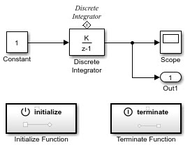 Добавление в модель блоков Initialize Function и Terminate Function (см. rtwdemo_irt_initterm). Блок инициализации функции использует блок записи состояния для установки начального состояния блока дискретного интегратора. Блок завершения функции включает в себя блок считывания состояния, который считывает состояние блока дискретного интегратора.