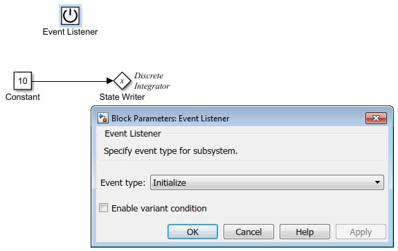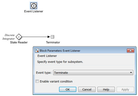 Параметр Тип события для блока прослушивателя событий для функций инициализации и завершения имеет значение Initialize и Terminateсоответственно. Функция инициализации использует блок записи состояния для инициализации входного значения для блока дискретного интегратора на 10. Функция завершения использует блок считывания состояния для считывания состояния блока дискретного интегратора.