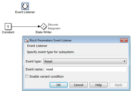 Для параметра Тип события (Event type) и Имя события (Event name) блока Прослушиватель событий (Event Listener) установлено значение Reset и resetсоответственно. Функция использует блок записи состояния, чтобы сбросить входное значение для блока дискретного интегратора на 5.