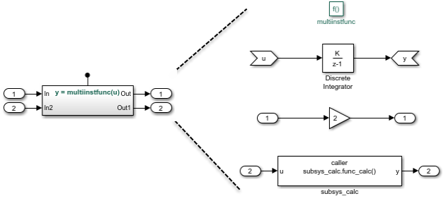 Вызывающая функция в функции multiinstfunc сконфигурирован с прототипом y = subsys_calc.func_calc(u). Префикс subsys_calc определяет подсистему, содержащую определение функции.