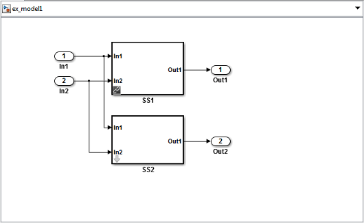 Создание модели верхнего уровня с двумя блоками модели, которые ссылаются на ex_model1 и ex_model2. Сохранить верхнюю модель как ex_mdlref_ssreuse.