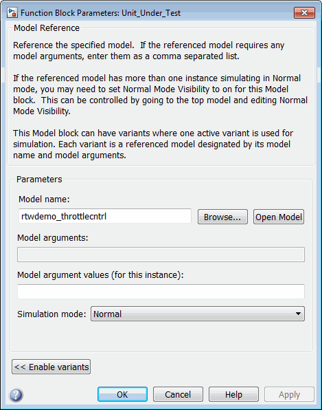 Просмотрите параметры привязки модели, щелкнув правой кнопкой мыши значок Unit_Under_Test и выберите Параметры блока (Model Reference).