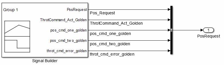 Подсистема использует блок построителя сигналов для источника тестового вектора. Блок содержит данные, управляющие моделированием (PosRequest) и предоставляет ожидаемые результаты, используемые Verification подсистема. В этом примере тестовый жгут использует только один набор тестовых данных. Как правило, необходимо создать набор тестов, полностью выполняющий требования системы.