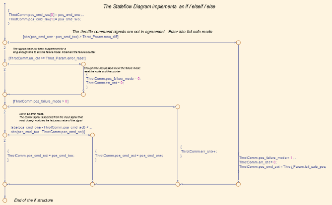 Откройте окно Pos_Command_Arbitration подсистема. Эта диаграмма Stateflow выполняет базовую проверку ошибок для двух командных сигналов. Если командные сигналы находятся слишком далеко друг от друга, диаграмма Stateflow устанавливает выходной сигнал в fail_safe позиция.