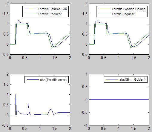 Нижний правый график показывает разницу между ожидаемым (золотым) положением дросселя и положением дросселя, которое вычисляет установка. Если разница между этими двумя значениями больше ± 0,05, моделирование прекращается.