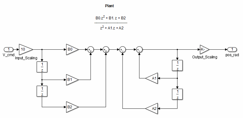 Plant подсистема моделирует динамику дросселя с передаточной функцией в каноническом виде. Можно создавать модели растений с различными уровнями точности. На различных этапах тестирования обычно используются различные модели растений.