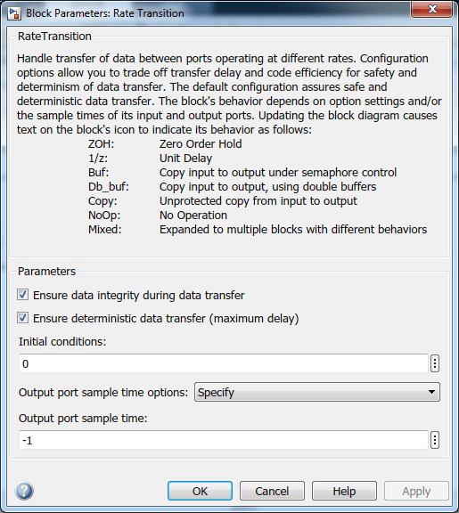 Предполагается, что блок Rate Transition используется в режиме по умолчанию (защищенный/детерминированный).