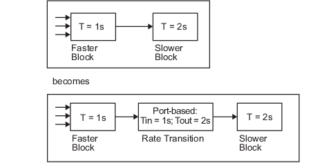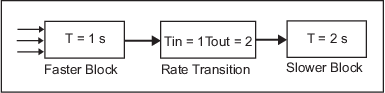Блок Rate Transition обрабатывает периодические (быстрые-медленные и медленные-быстрые) и асинхронные переходы. При вставке между двумя блоками различных скоростей дискретизации блок Rate Transition автоматически конфигурирует свои входные и выходные скорости дискретизации для типа перехода; нет необходимости указывать, является ли переход медленным к быстрому или быстрому к медленному (с низким к высокому или с высоким к низкому приоритетом для асинхронных задач).