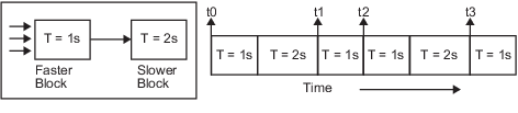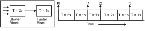 В модели, где более быстрый блок приводит в движение более медленный блок, имеющий прямой проход, выходы более быстрого блока вычисляются первыми. В интервалах моделирования, где более медленный блок не выполняется, моделирование продвигается быстрее, потому что есть меньше блоков для выполнения. Следующая диаграмма иллюстрирует эту ситуацию.
