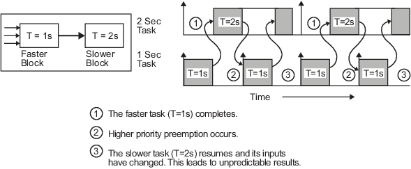Выполнение более медленного блока разделяется более чем на один интервал более быстрого блока. В этом случае более быстрая задача выполняется второй раз, прежде чем более медленная задача завершит выполнение. Это означает, что входные данные для более быстрой задачи могут иметь неверные значения в течение некоторого времени.