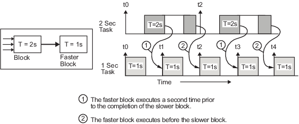 Чем быстрее выполняется блок перед более медленным блоком (который находится в обратном направлении от способа моделирования Simulink). В этом случае 1-секундный блок выполняется первым; но входные данные для более быстрой задачи не были вычислены. Это может привести к непредсказуемым результатам.