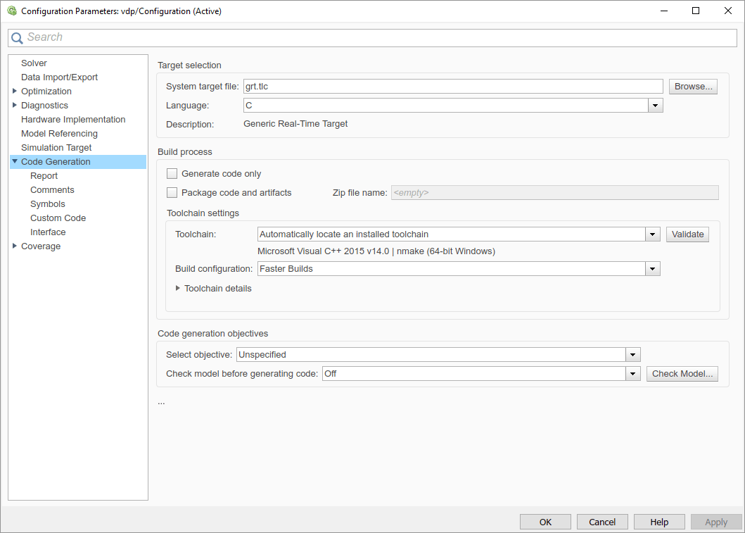 Конфигурация построения -- Указывает параметры оптимизации. По умолчанию для параметра «Конфигурация построения» установлено значение Faster Builds. Также можно выбрать Faster Runs, Debug, и Specify. При выборе Specifyможно настроить параметры для цепочки инструментов. При нажатии кнопки «Применить» пользовательские настройки цепочки инструментов применяются к текущей модели.