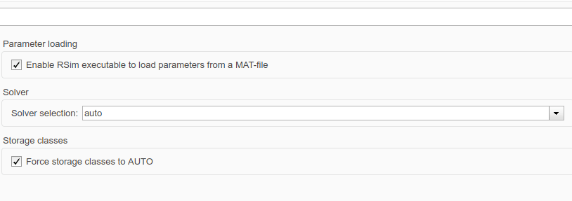 | Создание кода, позволяющего исполняемому файлу RSim загружать параметры из MAT-файла | Выберите Включить исполняемый файл RSim для загрузки параметров из MAT-файла (по умолчанию). |