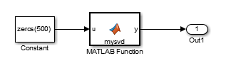 3. В блоке MATLAB Function добавьте код, вызывающий функцию линейной алгебры. Например, добавьте функцию mysvd который вызывает функцию MATLAB ®svd.