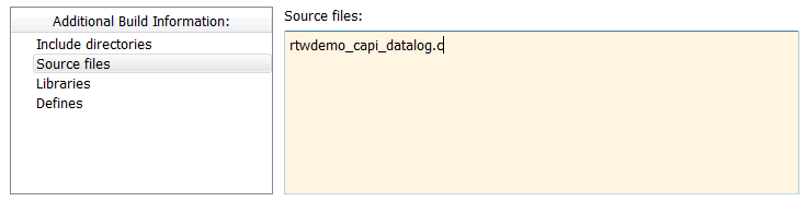 В подпанели «Дополнительная информация о построении» щелкните Исходные файлы и введите rtwdemo_capi_datalog.c.