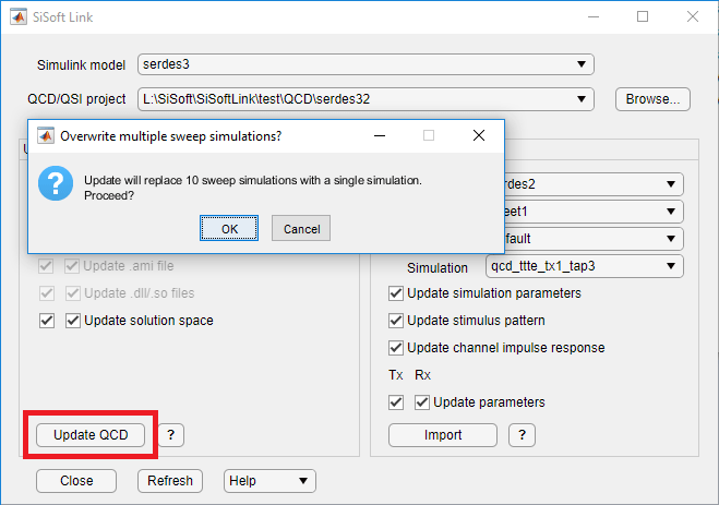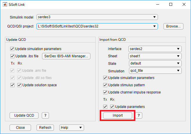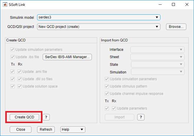 Если ваша системная модель SerDes открыта в Simulink, она отображается в раскрывающемся меню Simulink Model в приложении SiSoft Link. Нажмите кнопку Refresh, если ваша модель не указана. Установите в раскрывающемся меню проекта QCD/QSI значение New QCD project (create) и нажмите Создать QCD. Если есть нерешенные проблемы с выбранной моделью Simulink, кнопка Создать QCD остается выключенной.