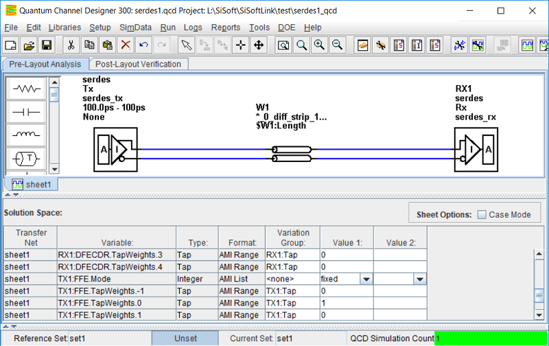 Выберите папку, в которой находится проект QCD, и имя папки проекта. Путь к папке и имя проекта не должны содержать пробелов. Если вы еще не использовали SiSoft Link для создания проекта, система запрашивает вас найти папку, содержащую ваше программное обеспечение SiSoft. Появляется окно отчета, и QCD открывает выполнение сценария, созданного SiSoft Link. По завершении выполнения сценария интерфейс проекта QCD переименовывается после системной модели SerDes с помощью одного листа. sheet1.