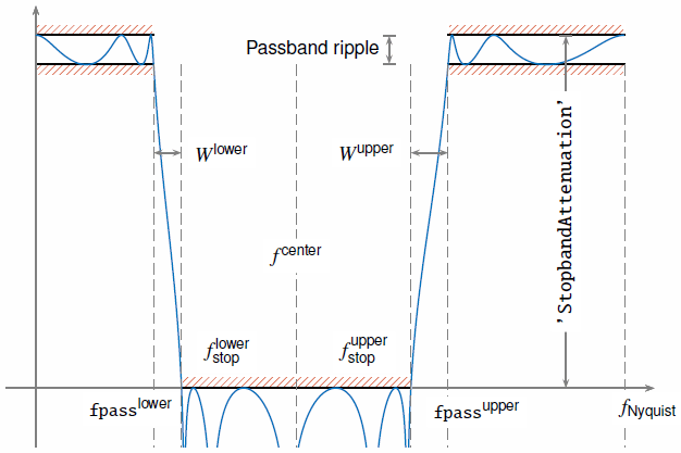 Нижние и верхние частоты стоп-полосы фильтра, fstoplower и fstopupper, являются частотами, между которыми затухание равно или больше значения, заданного с помощью 'StopbandAttenuation'.
