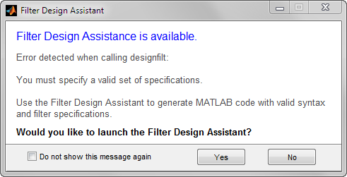 Есть некоторые случаи, в которых, учитывая недопустимый набор спецификаций, designfilt не предлагает мастер проектирования фильтров ни через диалоговое окно, ни через ссылку в сообщении об ошибке.