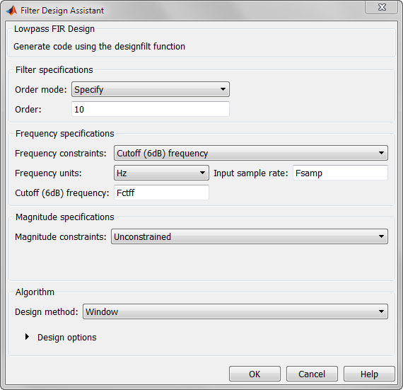 dee = designfilt('lowpassfir', 'FilterOrder', 10, ... 'CutoffFrequency', Fctff, 'SampleRate', Fsamp);