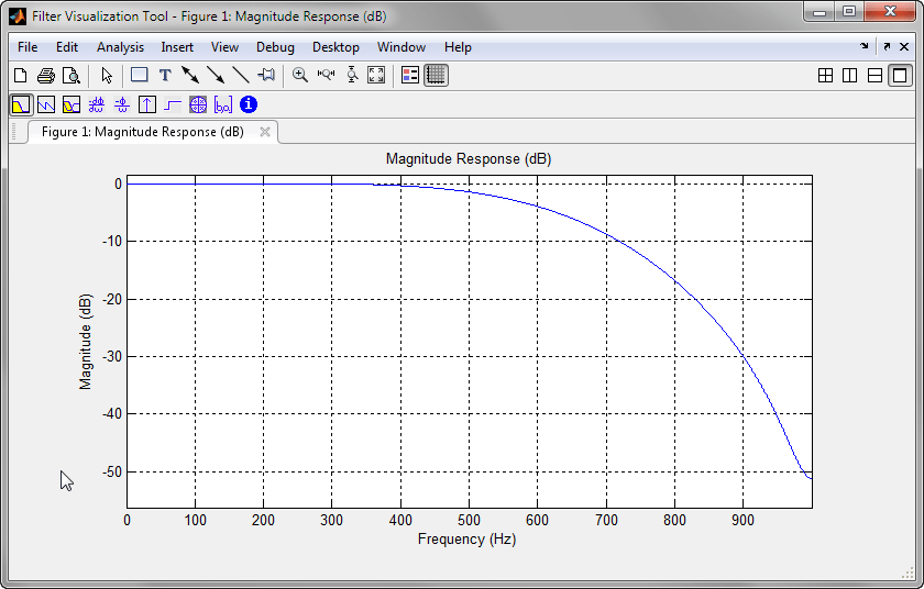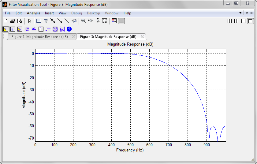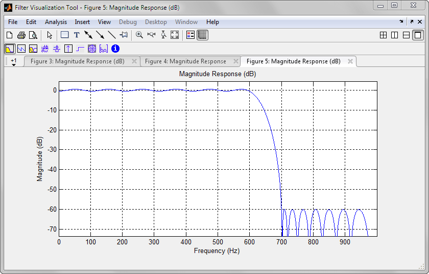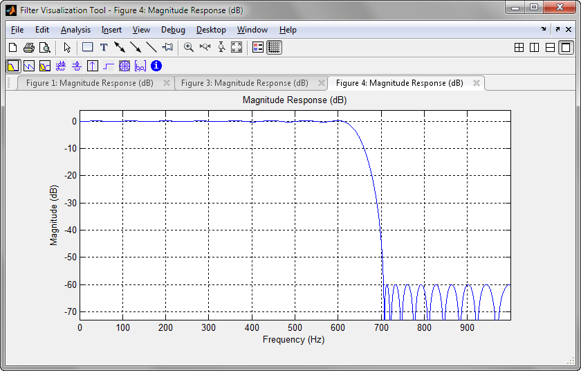 dee = designfilt('lowpassfir', 'PassbandFrequency', 600, ... 'StopbandFrequency', 700, ... 'PassbandRipple', 1, 'StopbandAttenuation', 60, ... 'SampleRate', 2000); fvtool(dee)