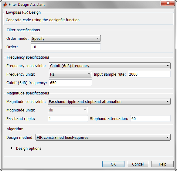 Fsamp = 2e3; Fctff = 650; dee = designfilt('lowpassfir','CutoffFrequency',Fctff, ... 'SampleRate',Fsamp);
