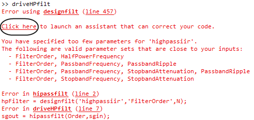Сообщение об ошибке дает возможность открыть ассистента для исправления кода MATLAB. Щелкнуть Click here , чтобы получить помощник по дизайну фильтров на экране.