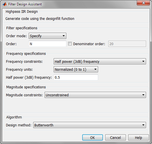 Если опустить ограничения по величине, designfilt использует значения по умолчанию.