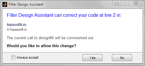 Использовать setpref('dontshowmeagain','filterDesignAssistantCodeCorrection',false) иметь designfilt исправьте код MATLAB, не запрашивая подтверждения. Также можно нажать кнопку Всегда принимать в диалоговом окне подтверждения.